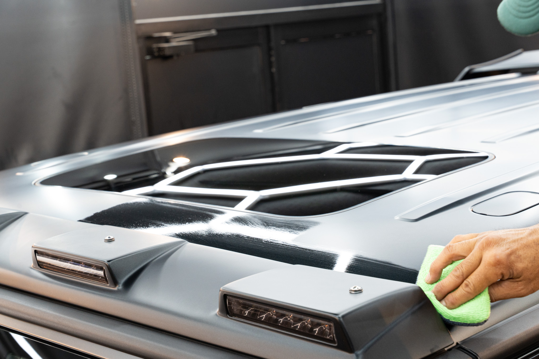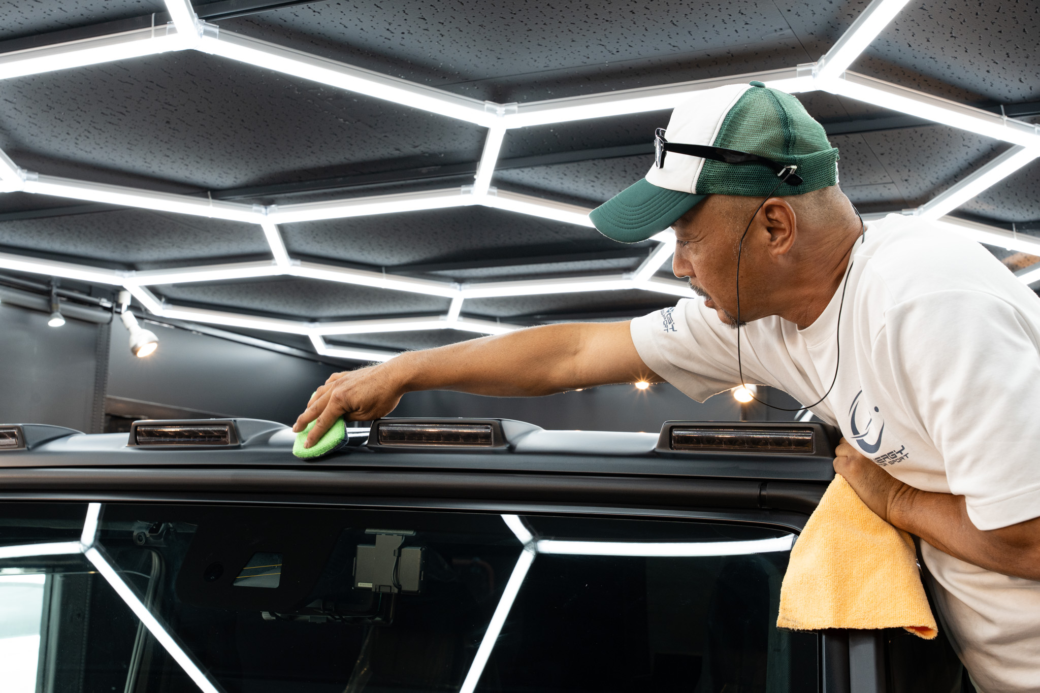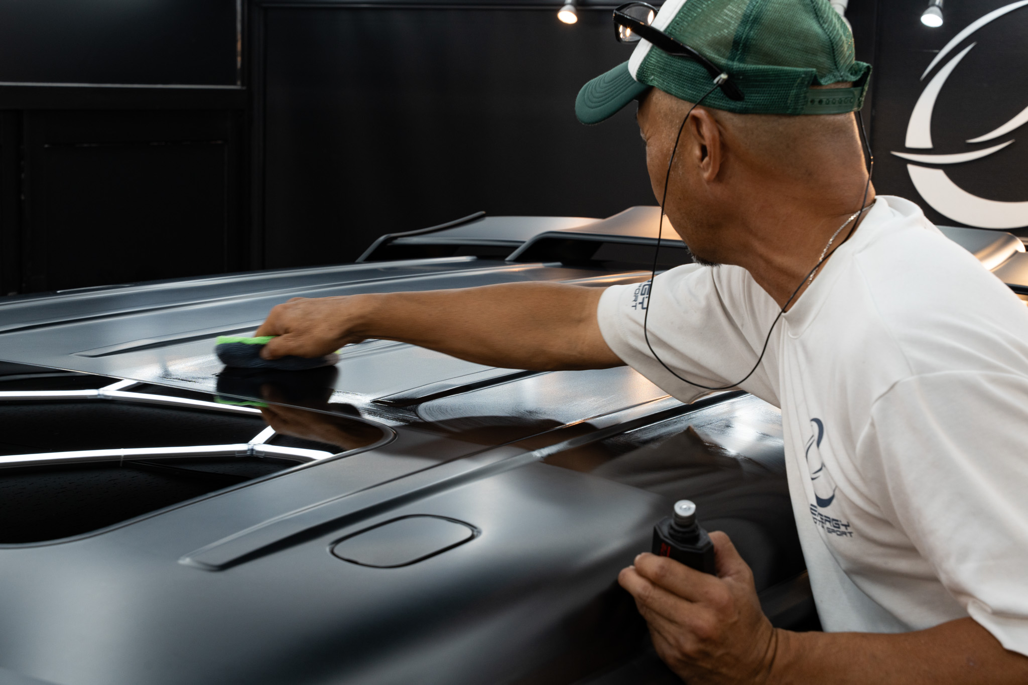 ディティーリングチームにより、現在、セラミックコーティング施工前の下処理(洗浄)が完了し、セラミックコーティング施工を開始しております。